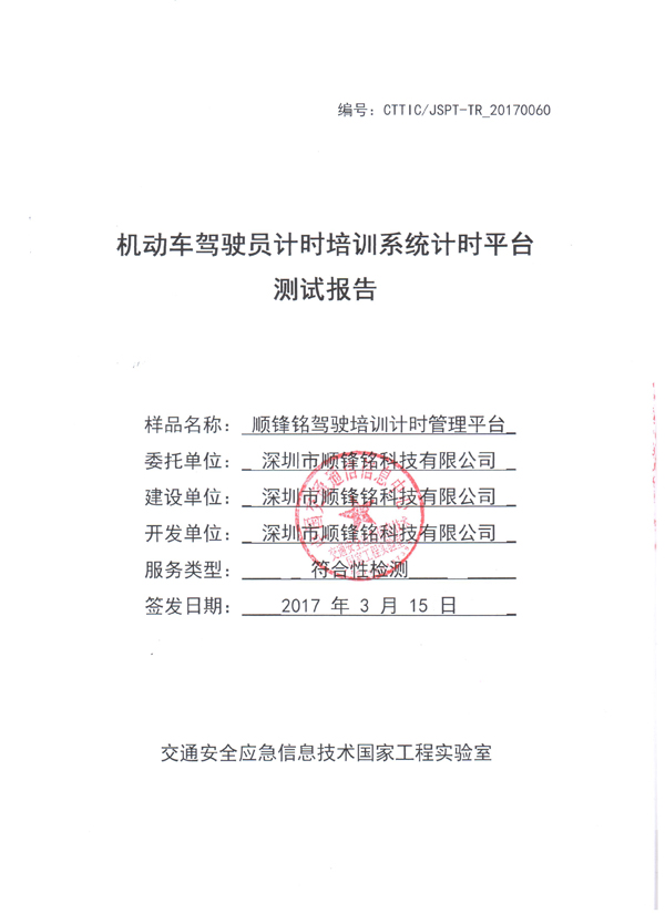 熱烈祝賀深圳順鋒銘科技順利通過“機動車駕駛員計時培訓(xùn)系統(tǒng)平臺技術(shù)規(guī)范”檢測?。。?