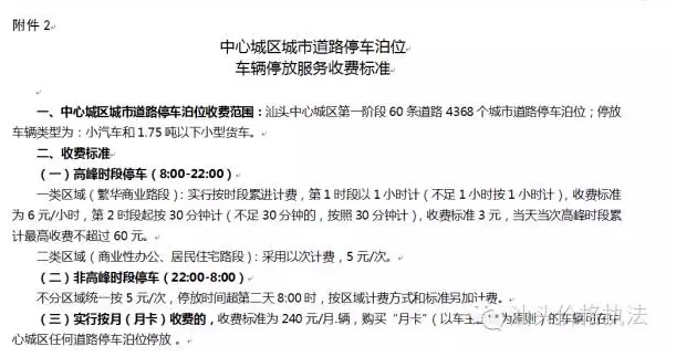 (二)路內(nèi)的人工停車(chē)場(chǎng)和自動(dòng)收費(fèi)停車(chē)設(shè)施機(jī)動(dòng)車(chē)停放保管服務(wù)收費(fèi)。中心城區(qū)城市道路停車(chē)泊位依照《汕頭市城市道路停車(chē)泊位管理規(guī)定》(汕頭市人民政府令第103號(hào))施劃,計(jì)費(fèi)方式和收費(fèi)標(biāo)準(zhǔn)按附件2執(zhí)行。