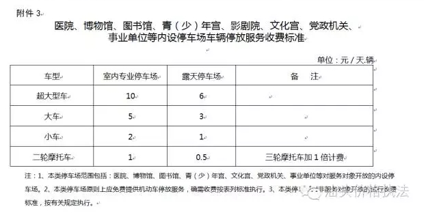 (四)醫(yī)院、博物館、圖書(shū)館、青(少)年宮、影劇院、文化宮、黨政機(jī)關(guān)、事業(yè)單位等對(duì)服務(wù)對(duì)象開(kāi)放的內(nèi)設(shè)停車(chē)場(chǎng),原則上應(yīng)免費(fèi)提供機(jī)動(dòng)車(chē)停放服務(wù)。為合理調(diào)節(jié)停車(chē)服務(wù)資源的利用或彌補(bǔ)正常服務(wù)費(fèi)用支出確需收費(fèi)的,中心城區(qū)按附件3標(biāo)準(zhǔn)執(zhí)行。